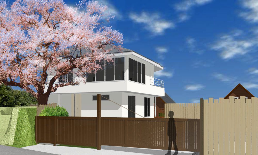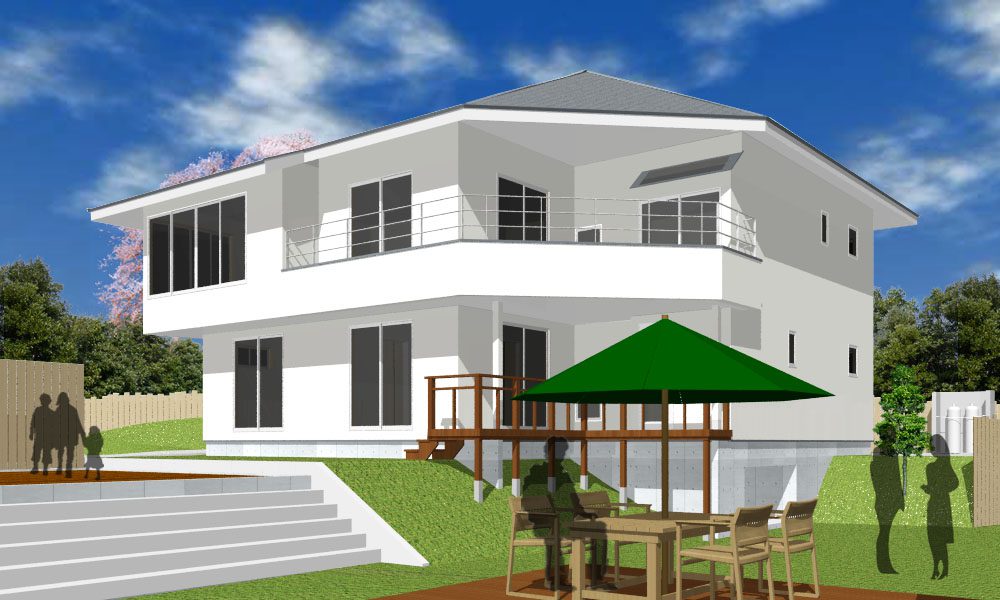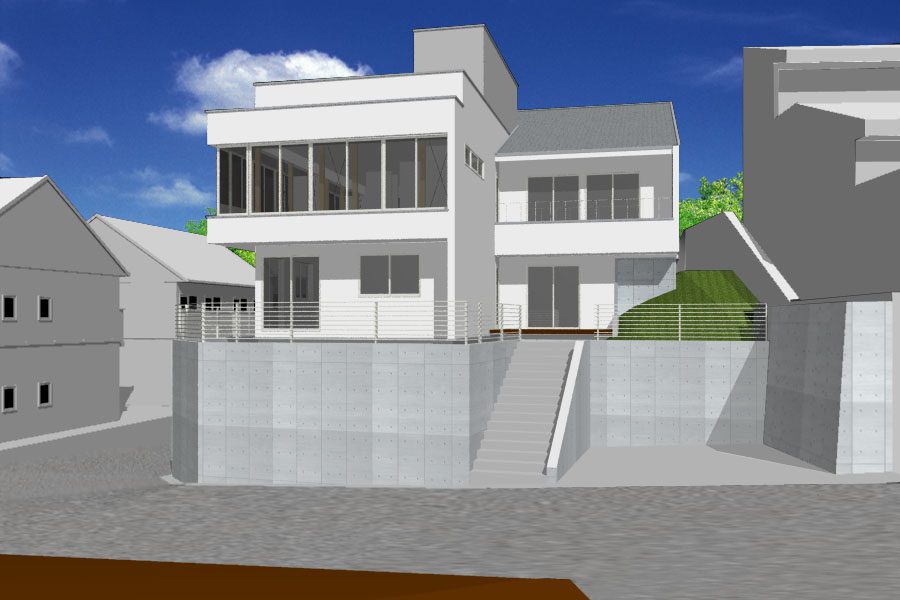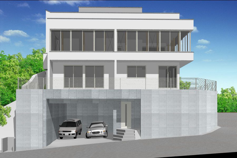 擁壁付分譲地(段差3m以上)に地下車庫+ホームシアタールーム付+玄関の木造2階建2世帯住宅(大阪府)