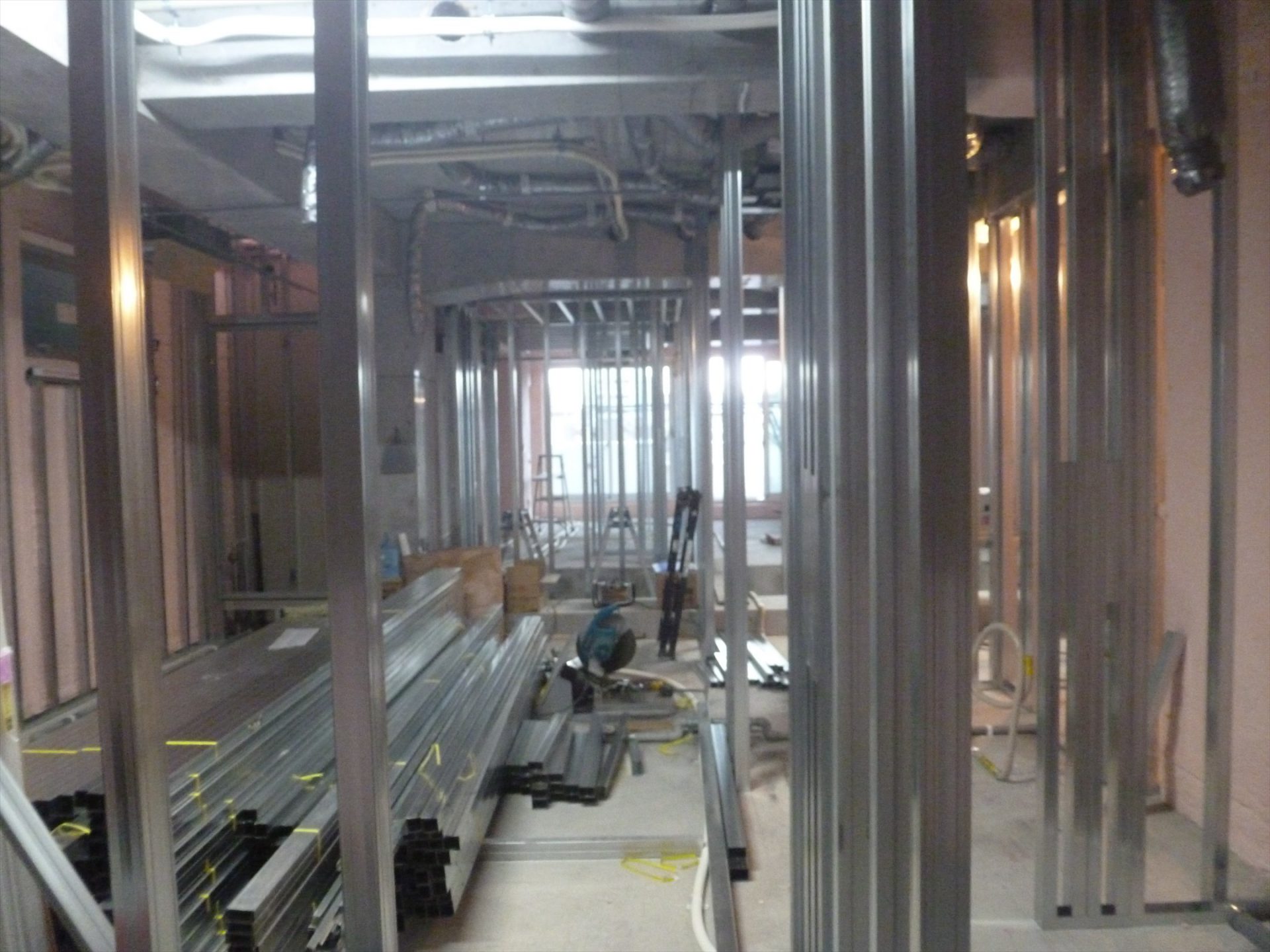 内部の柱や壁の下地は軽量鉄骨(LGSでLight Gauge Steel)で溶接されて床スラブと天井スラブにアンカーされて部屋の区画が出来上がってきました。