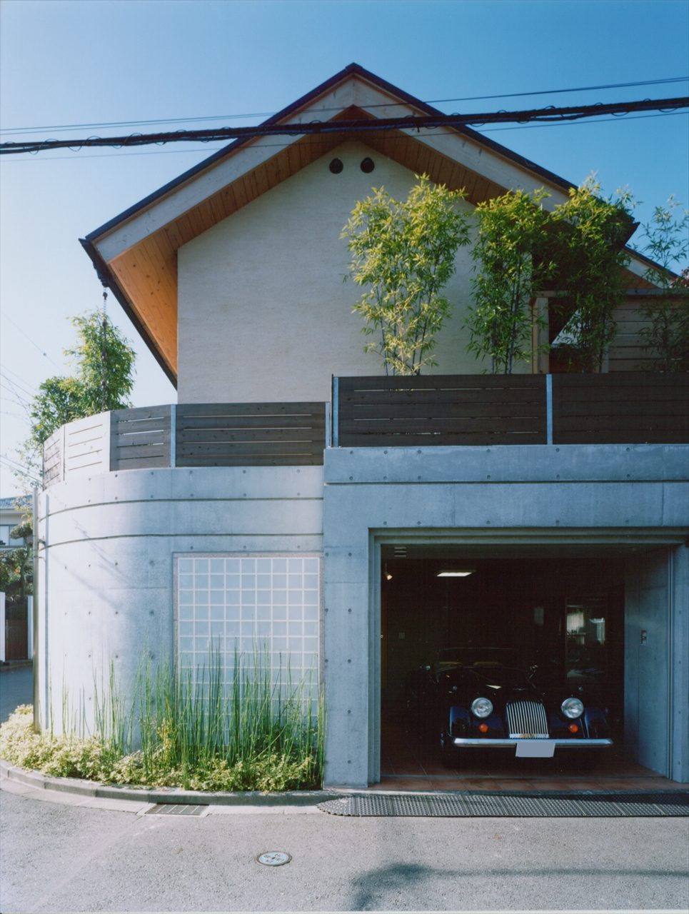 横浜市鶴見区の外車2台が入る中型ガレージ(道路側2台並列・横に玄関と書斎)