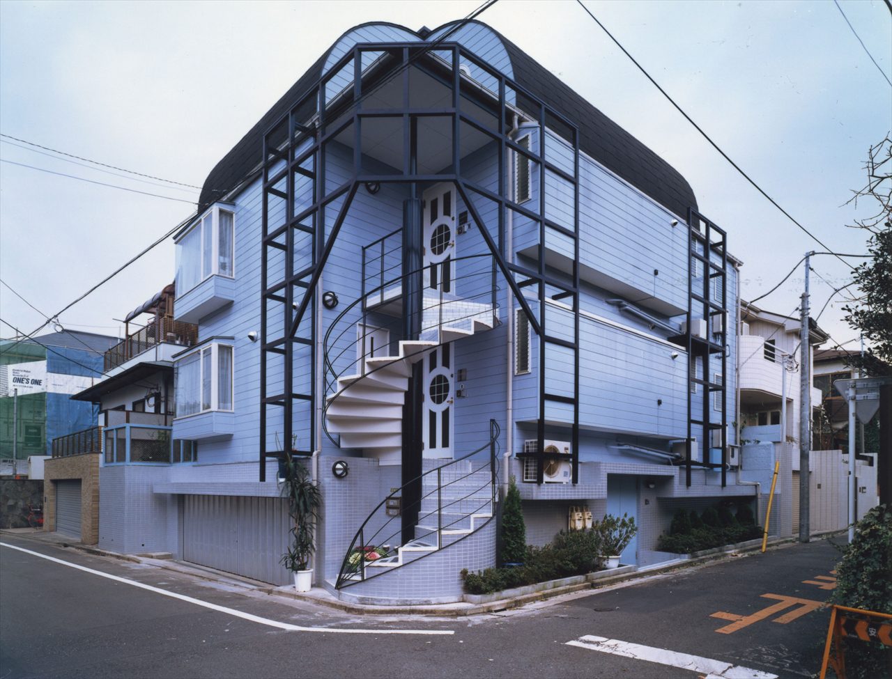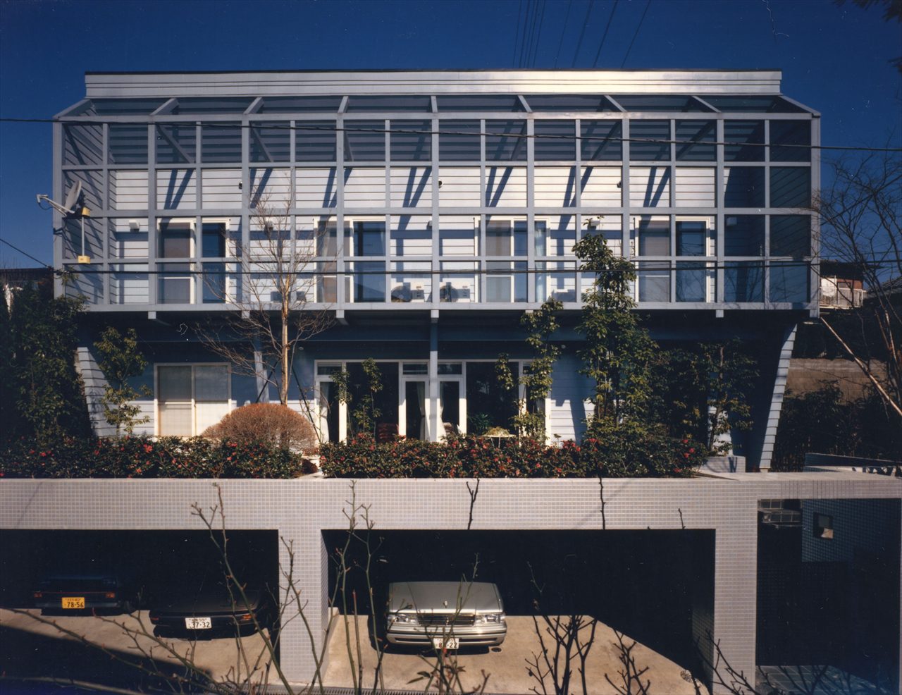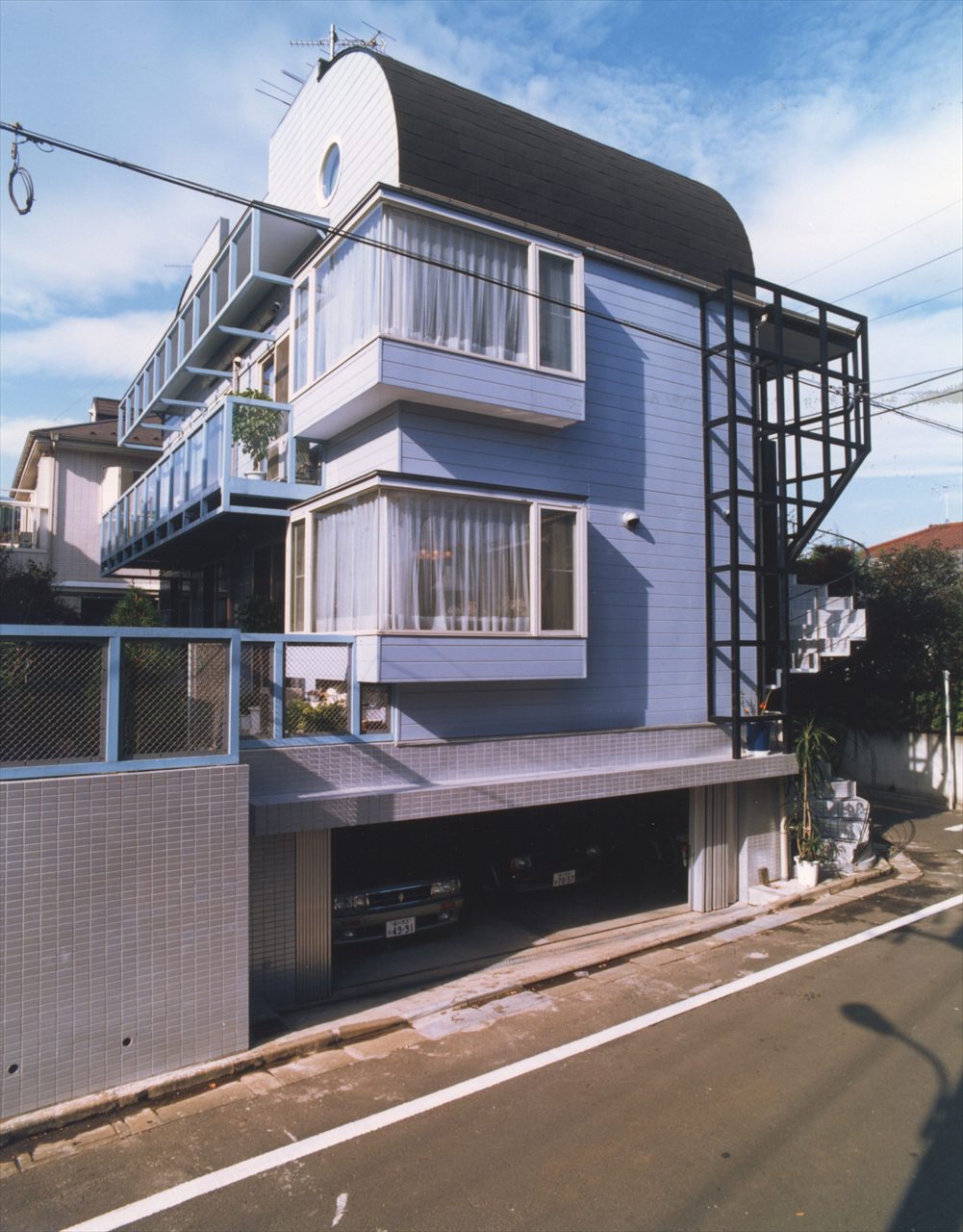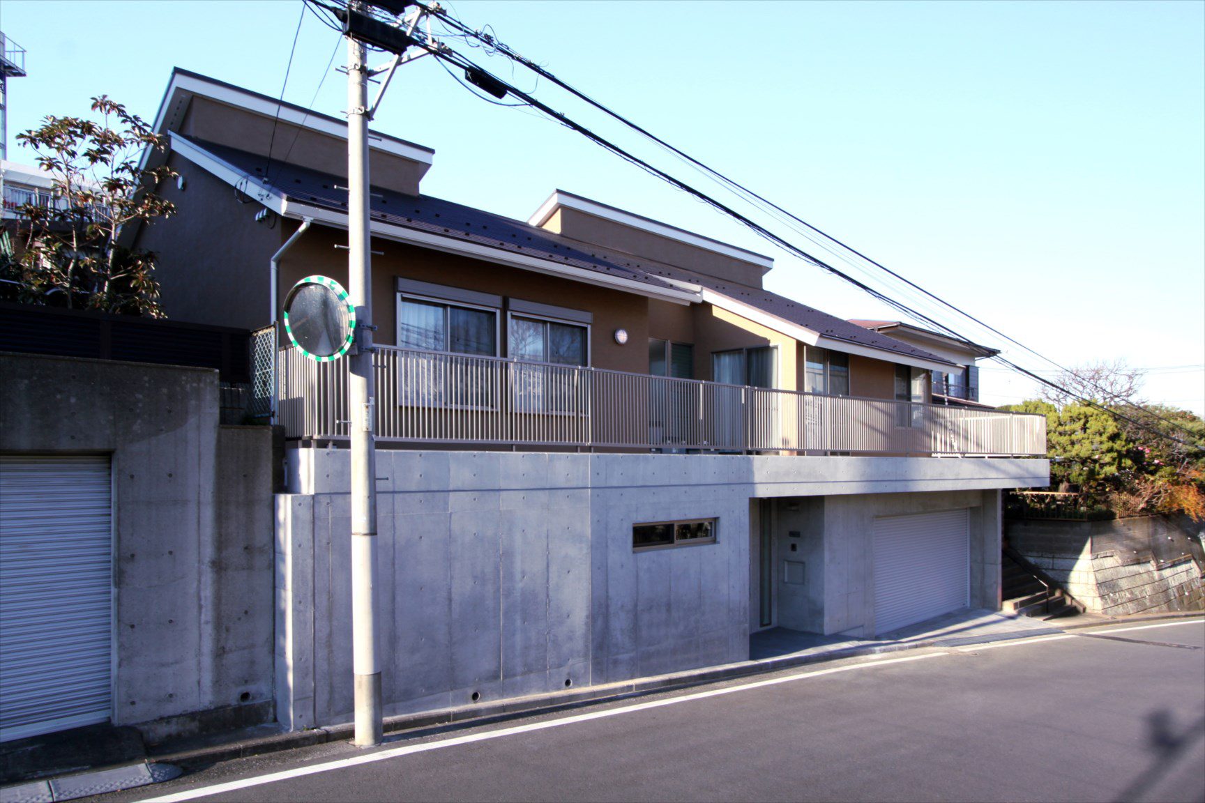 建物に向かって左側が子世帯へのアプローチ。建物右側に親世帯の玄関を設けて駐車場も含め地下ですべてがつながっている。