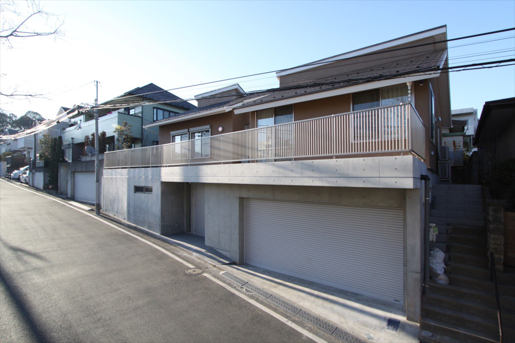 土砂崩れを防止する意味でもこうした擁壁地下室は有効で、RC造の重い箱(=地下室底部)の奥行は一般の擁壁底部の何倍もの大きさ重量になりますので建築地背部の擁壁の土地所有者さんにも安全性を提供していることになります。